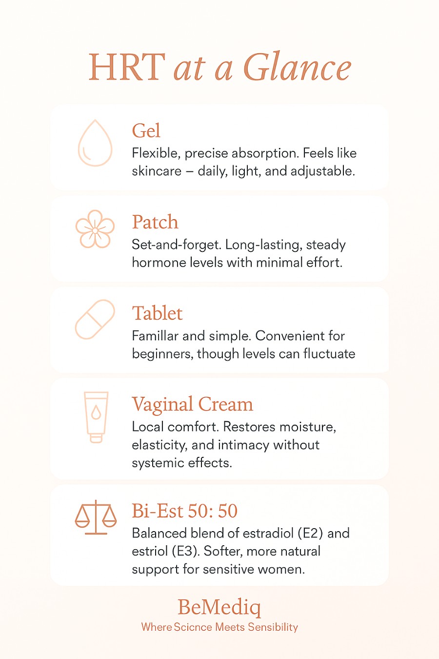 The first step isn’t choosing between a gel, patch, or tablet — it’s understanding if your body truly needs hormonal support at all. (Read: The Complete Guide to Perimenopause & Menopause)