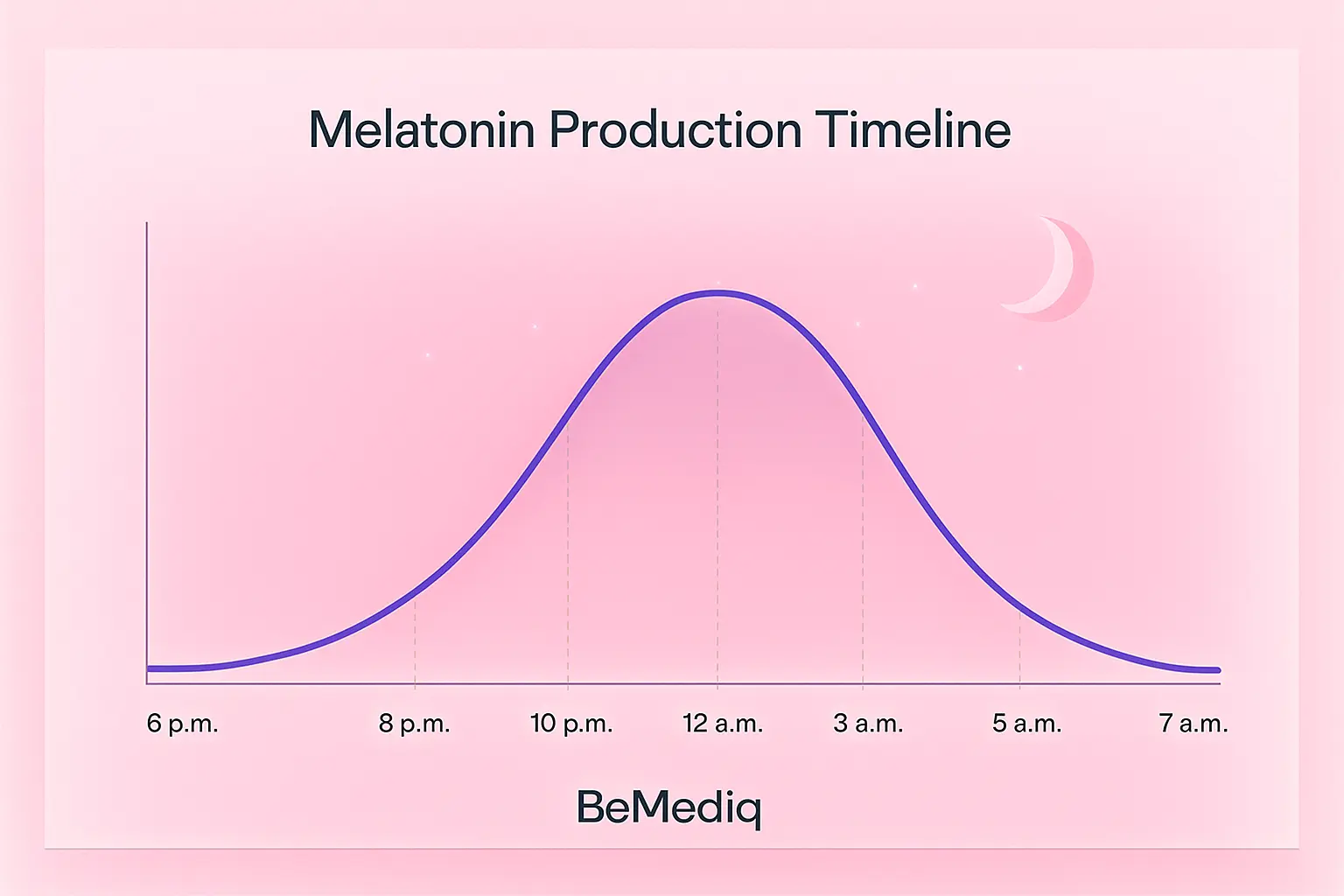 - Rise: ~ 9:00–10:30 p.m. Melatonin increases steadily, core temperature falls, and the body prepares for repair. This is also the ideal window to fall asleep, so the first deep-sleep cycle can begin on time — the phase most responsible for recovery, repair, and hormonal stability.