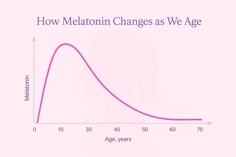 Melatonin naturally declines with age — a finding consistently reported in circadian and endocrine research over the past decades. By our 50s and 60s, the pineal gland produces far less than it did in our twenties, which is one reason why sleep becomes lighter and recovery slower in midlife.